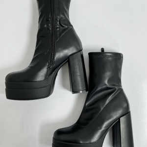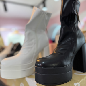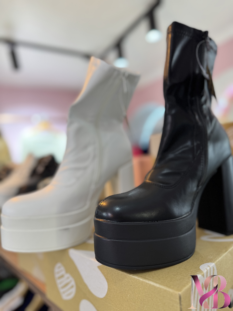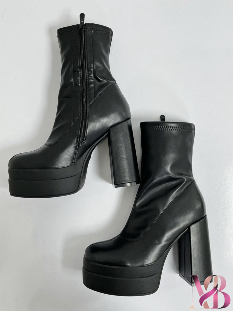 Confeccionadas en eco cuero de alta calidad, ofrecen un acabado liso y brillante que envuelve el pie con estilo y comodidad. Su taco ancho y plataforma elevada estilizan la figura sin sacrificar estabilidad, brindando una pisada segura y elegante.