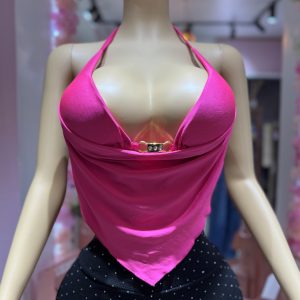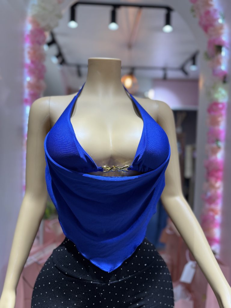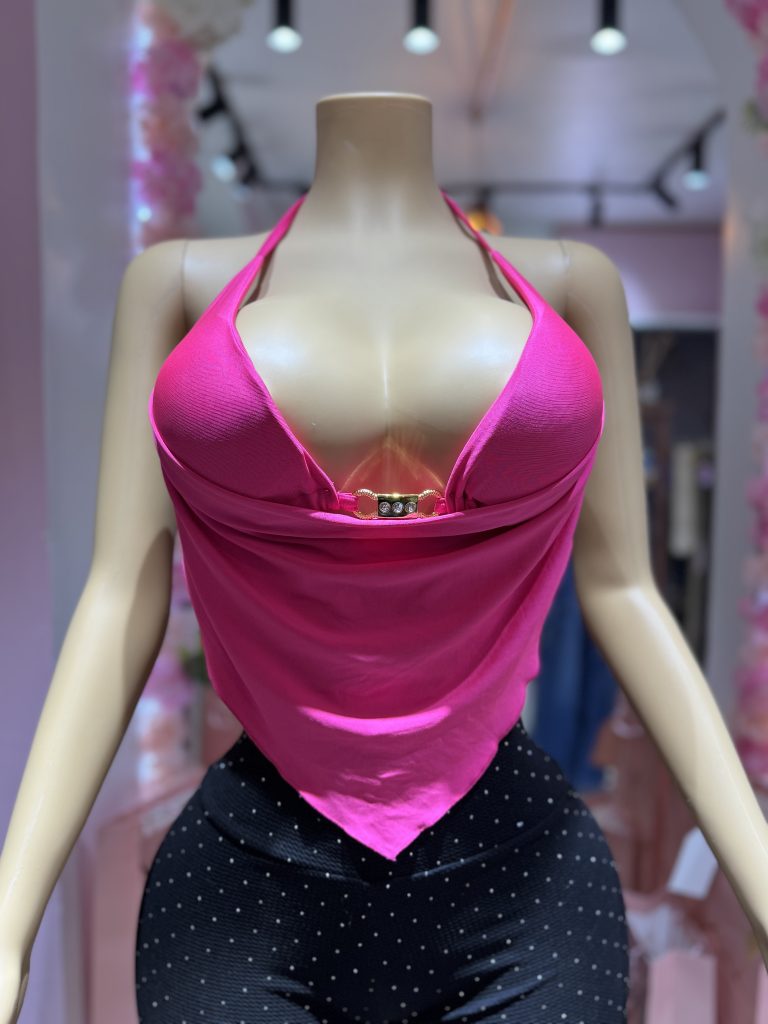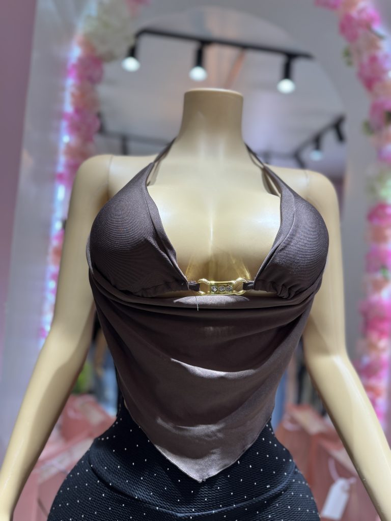 Su diseño triangular y escote halter realzan delicadamente el contorno del busto, mientras el broche central añade un toque de glamour sutil que transforma cualquier look.
