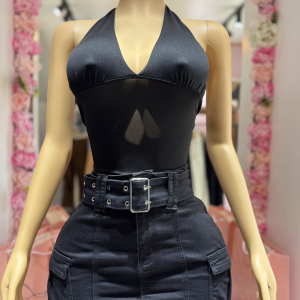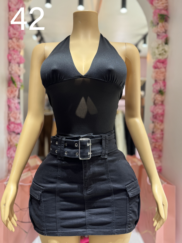 Confeccionada en denim elástico de alta calidad, su ajuste se adapta perfectamente al cuerpo, modelando la figura con suavidad. El diseño con bolsillos laterales y cinturón con hebilla metálica aporta un aire urbano y moderno, mientras su color negro profundo se convierte en el aliado perfecto para crear looks tanto casuales como de noche.