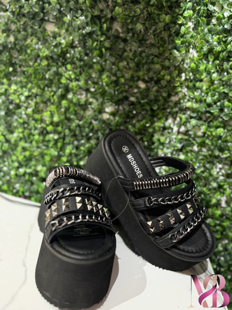 Su base alta y ligera estiliza la figura, mientras que las tiras adornadas con apliques metálicos y cadenas aportan un brillo sutil que atrapa miradas. Elaboradas en material sintético de alta calidad, ofrecen una pisada firme y confortable, perfecta para acompañarte desde el día hasta la noche.